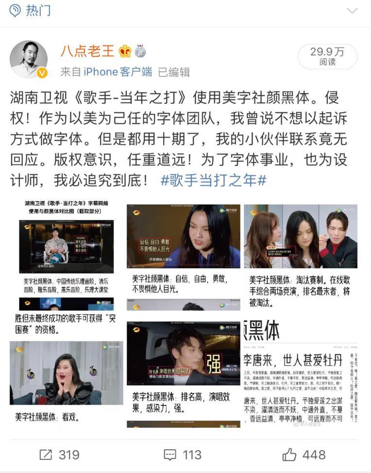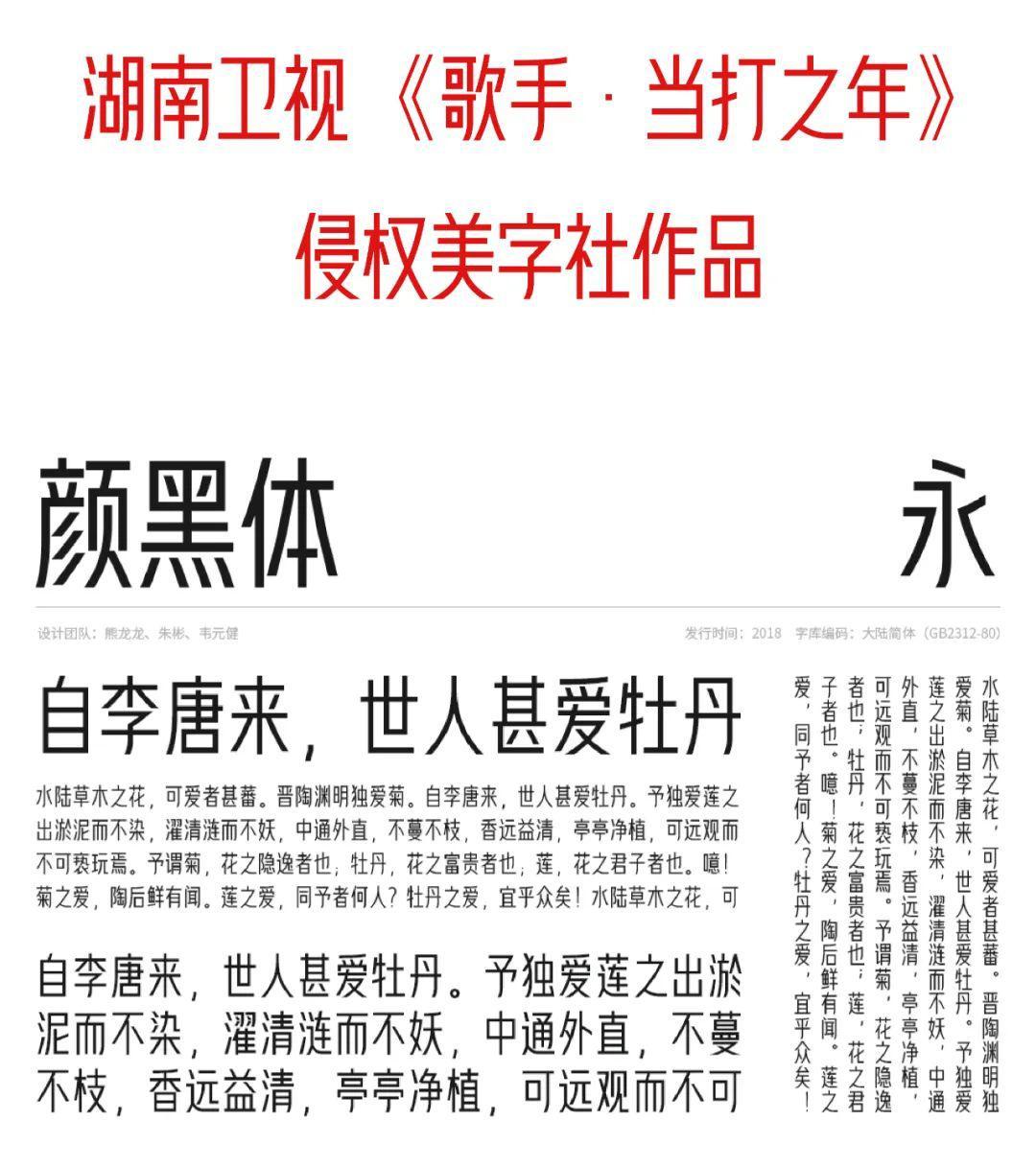 湖南卫视《歌手-当打之年》侵权使用美字社颜黑体,经过我的小伙伴持续的努力,终于回到了最初的模样,什么回应也没有,事情就像没有发生一样,侵权仍在继续!今天我要把维权之难和各位分享,请把手中的水先放下。听说细说。