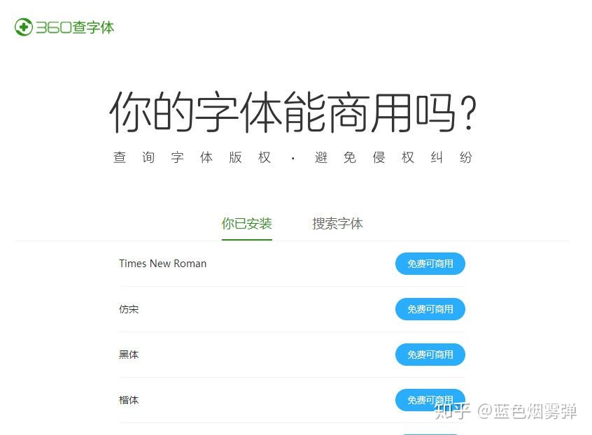 360推出了360查字体的工具,可以一键检测电脑安装字体是否免费或是“商用需授权”的,非常的方便使用,大家可以试试,工具地址:http://fonts.safe.360.cn/。目前功能还在完善中,不是所有的字体都能查到。