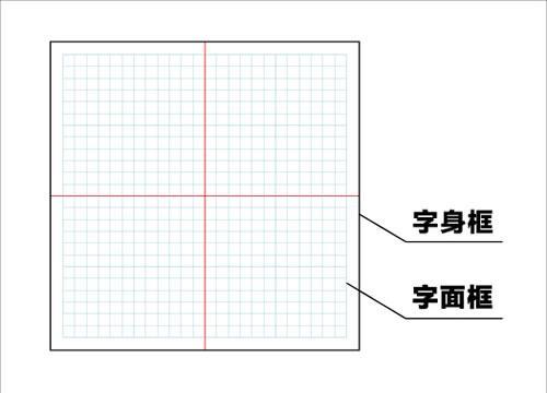 我们有必要先来搞清楚两个不同的概念:“字面大小和字身字面比”。字体设计专用方格都有两个方框,外框称字身框,内框称字面框。