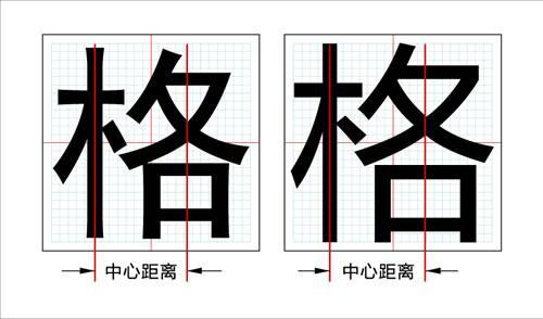 字面大小又可分为可测量的字面大小和视觉上的字面大小。已故字体设计大师谢培元老师在1962年归纳总结的“第二中心线”理论已表明,汉字由形声组合的字都是可以测量的,形旁和声旁这两个部件的中心距离越大,字面就越大,反之,字面就越小,我们只要测量这两个部件的中心距离就可以得到相应的字面大小值。同时,这也是控制整副字大小的有效工具。