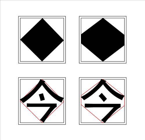 要想做大字面的字,我们首先要考虑面积最小的菱形,那么,怎样才能把菱形字做大?很简单,只要适当调整改变菱形的形状,那么,我们就能得到比原来菱形面积大的形变图形,用这种方法来设计,就可以得到在视觉上比原先字面大的字。