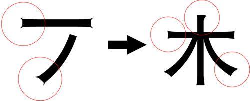 点划的头已伸不出去,还要斜,既不美观,又破坏形象。在头见短,伸不出去的情况下,还是做的稍平些比较妥当,头也长了,字也显得正气。