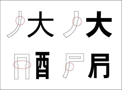 过大的喇叭头,不但失去了黑体字应有的品格,在屏显时,“喇叭头”能在笔划两头多出一块,如果两笔离得较近,头就有可能连上,使笔划交代不清,可读性变差。