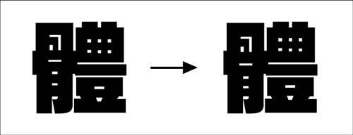 这两个字一粗一细,视觉上看是两款字,粗细调整不当。首先,把细的“體”字加粗,使两个字的视觉粗细一致。