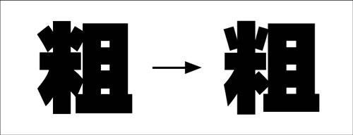 现在我们来调整“粗”字,先分析一下粗字的那些地方需要改进,米字过大过黑,形象欠佳并压迫且字,从而使结合部太紧,整字见窄。改进的方法是:缩小米字,放大且字,减细米字上方的八字点,改善横眉竖眼的“凶”相并使点见长,加长撇梢,使其舒展,分清下点使其交代清楚。通过这些调整,粗字变得面貌一新,提高了品位。